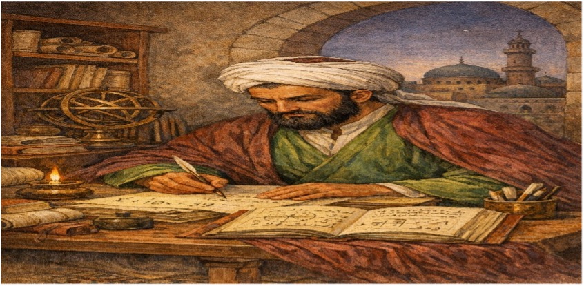 Muhammad ibn Musa al-Khwarizmi, the pioneering scholar of the Islamic Golden Age, working on mathematical equations that laid the foundation for algebra.